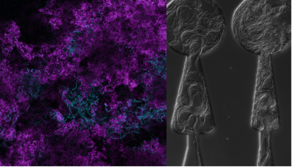Slika 2: Desno: Kokultura dveh fluorescenčno označenih sevov B. subtilis je bila nacepljena v tekoče gojišče. Pelikel, ki nastane po 16 urah, kaže ločitev obeh sevov v vijolične in modre skupine. Na levi: mikropretočni sistem, zasnovan za zajemanje rastočih celic B. subtilis. Podolgovate bakterijske verige so zasedle razpoložljivi prostor.