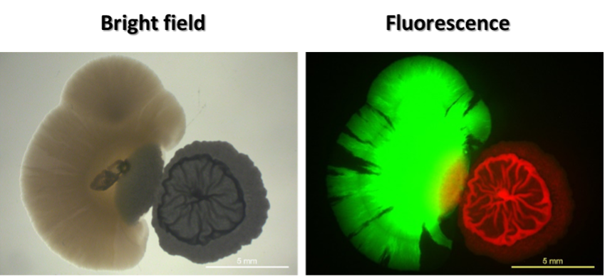 Slika 3: Interakcije med bakterijama B. subtilis (rdeča) in Salmonella enterica serovar Typhimurium (zelena) na trdnem gojišču TSB. Na sliki so prikazane interakcije po 48 h ur gojenja, kjer vidimo invazijo bakterije B. subtilis v kolonijo bakterije S. Typhimurium – predvidevamo, da bakterija B. subtilis sintetizira protimikrobne spojine, ki povzročijo lizo celic bakterije S. Typhimurium.